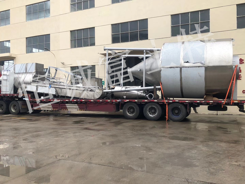 空氣經(jīng)過濾和加熱,進入干燥器頂部空氣分配器,熱空氣呈螺旋狀均勻地進入干燥室。料液經(jīng)塔體頂部的高速離心霧化器,(旋轉(zhuǎn))噴霧成極細微的霧狀液珠,與熱空氣并流接觸在極短的時間內(nèi)可干燥為成品。成品連續(xù)地由干燥塔底部和旋風分離器中輸出,廢氣由風機排空。
