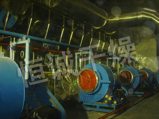散粒狀固體物料由加料器加入流化床干燥器中,過濾后的潔凈空氣加熱后由鼓風機送入流化床底部經分布板與固體物料接觸,形成流態化達到氣固的熱質交換。物料干燥后由排料口排出,廢氣由沸騰床頂部排出經旋風除塵器組和布袋除塵器回收固體粉料后排空。